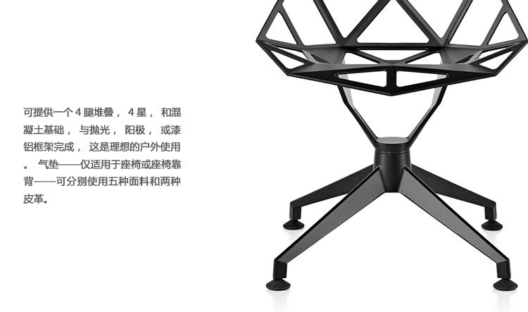 最受瞩目的德国设计师Konstantin Grcic 应邀为MAGIS 设计的Chair One(几何吧椅),是设计生涯中最具有标志的产品之一。办公椅体为模铸铝合金结构,经过氟化钛镀膜与塑料粉末涂布。椅子具有阻燃性、抗腐蚀性。适合室内及室外使用。以铝金属与钛金属制成的 Chair One,以多个平面以不同角度组合而成,建立起立体的外型。多个中空的三角型组合而成的座椅,不但令为用家带来强而有力的承托结构,而且还能在简单设计之中带出不一样的风格。这把椅子的惊人形象难免使人对它的舒适度产生疑问,但当你真正坐于其上,你会发现它实际上非常舒适,那些稀疏的网状结构能够极好地支撑不同体型的人体,后背上的把手也非常实用。当你知道Chair-One最初是被当作户外用椅而设计的,你会更加佩服Konstantin Grcic的缜密用心:极少的表面可以杜绝雨水,并且减少灰尘堆积,夸张的形态则令它能够在街道、建筑或自然的环境中拥有自己美学上的存在,而不是被环境所吞没。Konstantin Grcic花了三年时间设计Chair One,自2003年诞生以来,堪称Grcic精简主义风格的代表作。2006年,Chiar One为Konstantin Grcic赢得了德国政府的设计大奖。