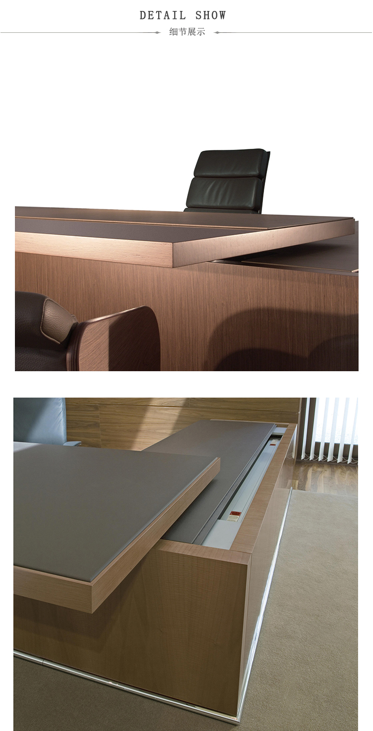 轻质加固50mm厚桌面桌,采用金属核心结构。工作桌面区域采用Techno Leather软垫。50mm结构前板在底部用不锈钢板完成。“L”形前板隐藏在主桌面下方的滑动翼。当滑动桌翼打开时,沿着桌子的整个长度配备集成的电缆管理。(需要说明的是,桌面机翼在右侧或左侧,相对于工作桌面位置)