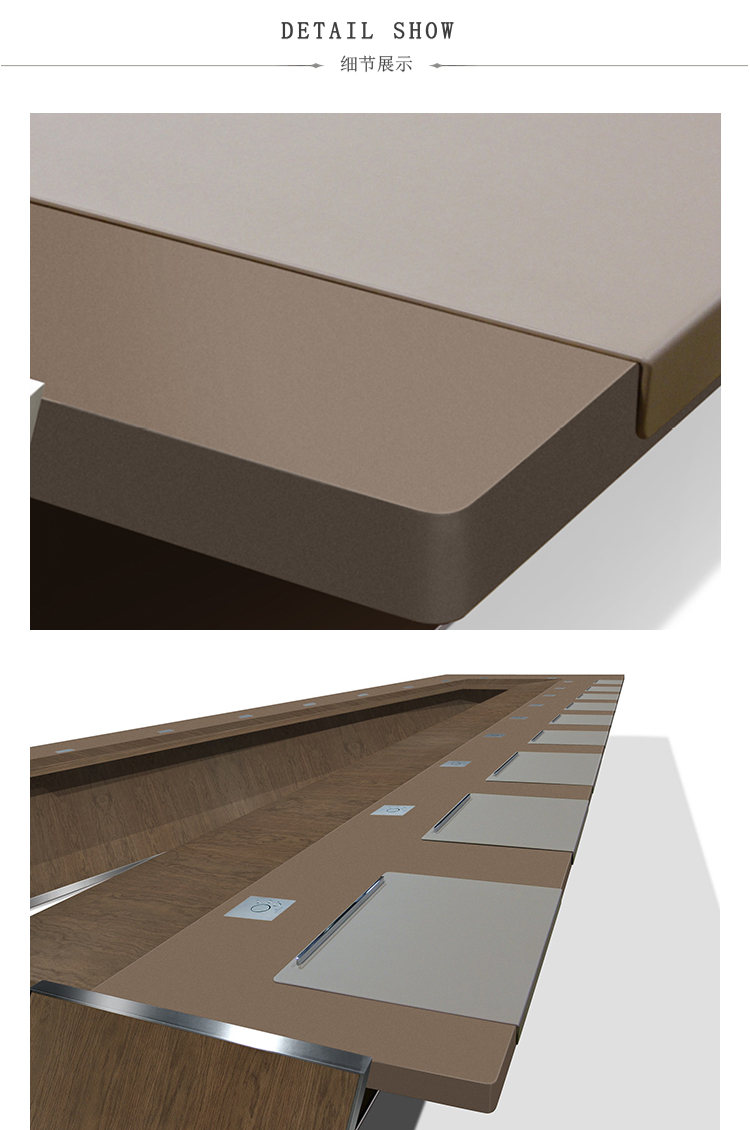 会议桌。50mm厚的直线顶部,在桌子内侧打开。顶部分为两部分,允许不同材料和饰面的组合。表专门设计用于集成可伸缩电脑显示器,电缆管理和电子系统的其他部分。底座由隐藏的金属结构组成,桌面内侧采用FIXED INCLINED面板封闭,外侧采用可拆卸面板,可方便地进入桌面内部,以便进行电缆管理和维护。表面处理:混合成品顶部采用木材,微纹理漆或Techno Leather软垫。固定面板,木质或漆面。