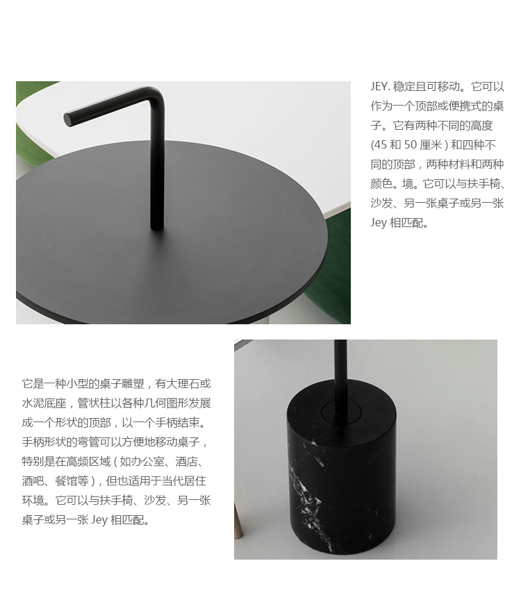 JEY.稳定且可移动。它可以作为一个顶部或便携式的桌子。它有两种不同的高度(45和50厘米)和四种不同的顶部,两种材料和两种颜色。它是一种小型的桌子雕塑,有大理石或水泥底座,管状柱以各种几何图形发展成一个形状的顶部,以一个手柄结束。手柄形状的弯管可以方便地移动桌子,特别是在高频区域(如办公室、酒店、酒吧、餐馆等),但也适用于当代居住环境。它可以与扶手椅、沙发、另一张桌子或另一张Jey相匹配。