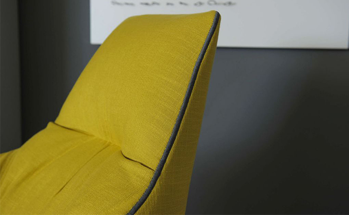 "The Santa Monica Lounge armchair,characterized by a unique design,is a project conceived by the French designer Jean-Marie Massaud,and it is produced by Poliform,a leading company in the made in Italy furniture manufacture.The Santa Monica Lounge armchair on sale in our showroom is matched with the Santa Monica ottoman.Both the items are covered in fabric,yellow colour,with iron coloured stitches."