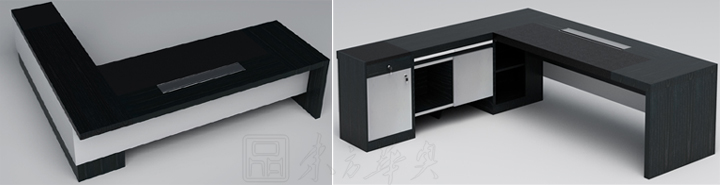 ※ 上图为班台的正面与背面的展示图,L型班台,简约时尚,比较适合做大规格尺寸,适合大空间放置,木纹清晰,银色油漆饰边面!