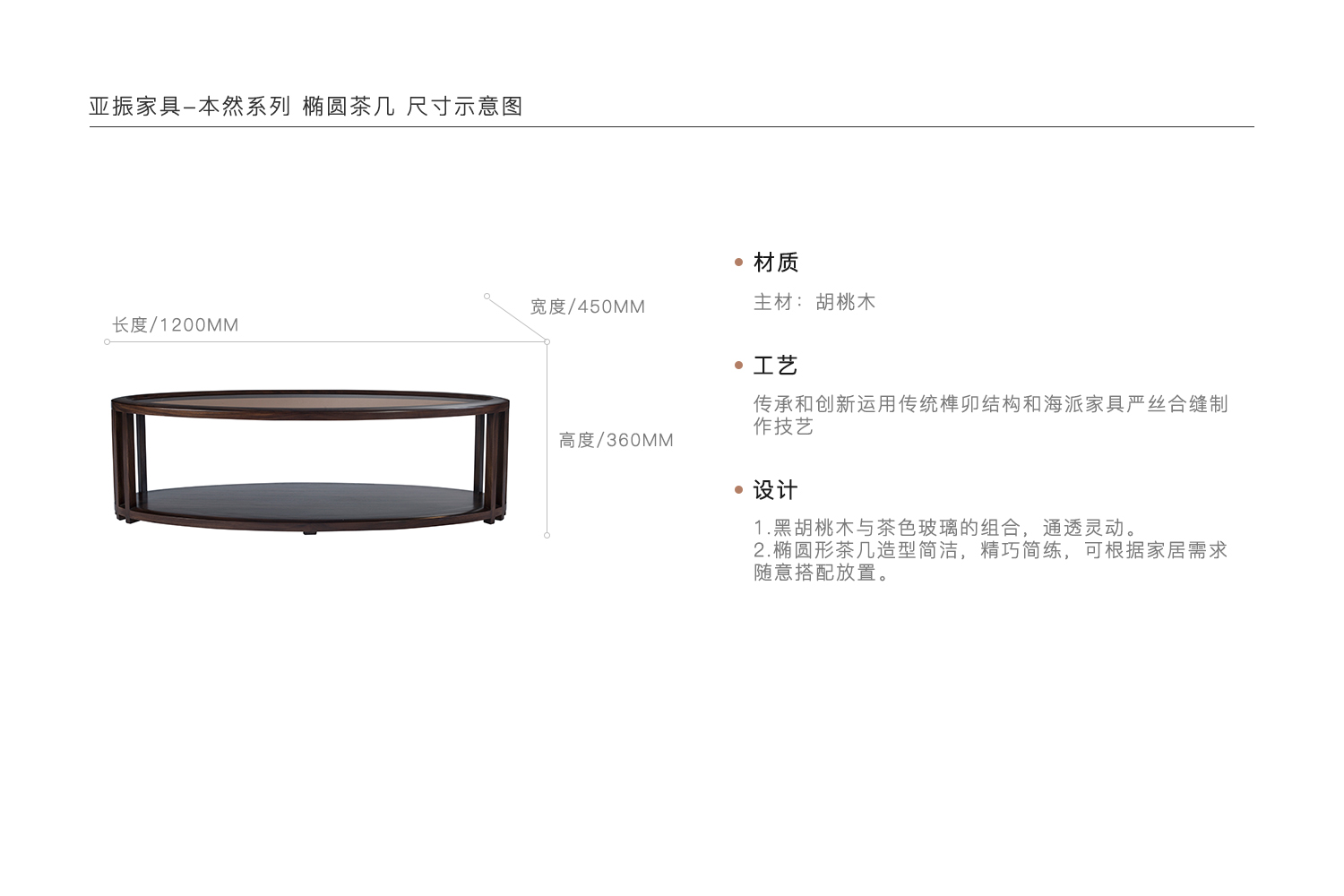 1.黑胡桃木与茶色玻璃的组合,通透灵动。 2.椭圆形茶几造型简洁,精巧简练,可根据家居需求随意搭配放置。