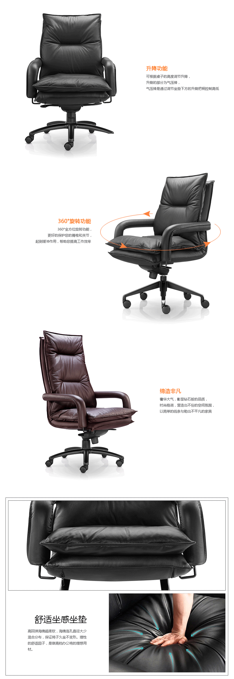 时尚款办公椅,流畅的线条,性感而妖娆,色泽细腻的光线,享受自己的独特宁静。高回弹海绵超柔软,海绵泡孔直径大少混合分布,保证椅子久坐不变形。理性的舒适因子,是做高档办公椅的理想用材。
