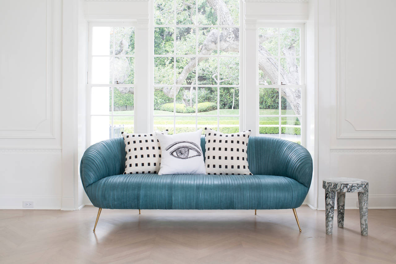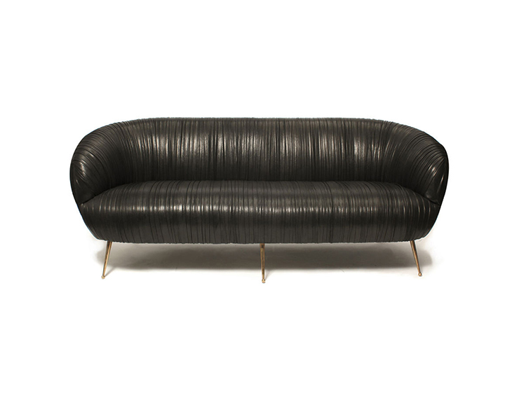 这款沙发的精致线条采用标志性褶皱皮革细节设计。 窑干硬木框架采用双榫和胶合,配有8向手工弹簧。 全面的蔬菜染色小羊皮手工缝制在框架上。 这款精致细腻的豪华沙发坐落在坚固的青铜铸造的锥形腿上。 完美适合厨房长椅,客厅或床边。