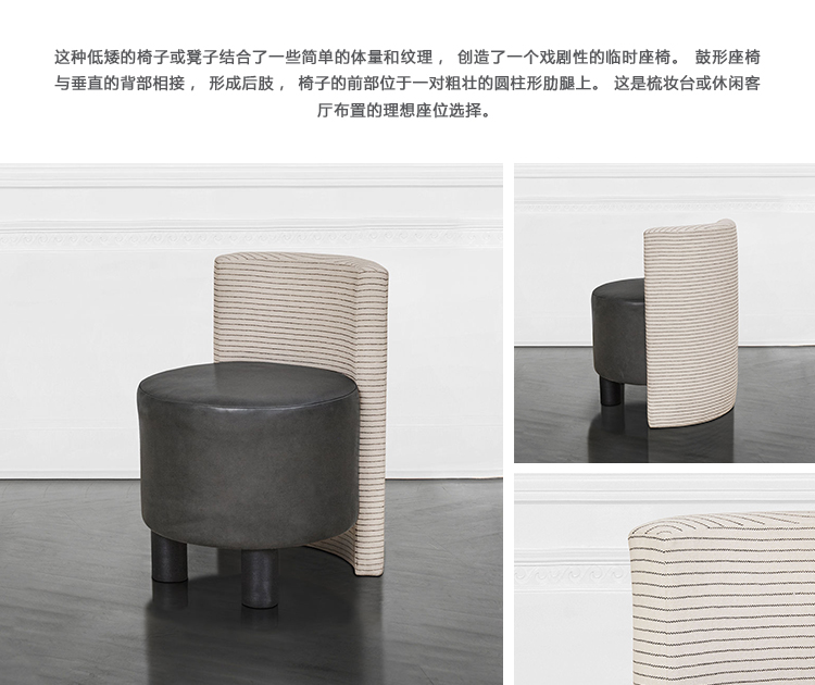 这种低矮的椅子或凳子结合了一些简单的体量和纹理,创造了一个戏剧性的临时座椅。鼓形座椅与垂直的背部相接,形成后肢,椅子的前部位于一对粗壮的圆柱形肋腿上。 这是梳妆台或休闲客厅布置的理想座位选择。 腿部饰面选项包括漂白,天然和黑檀木。 提供精选面料和皮革。