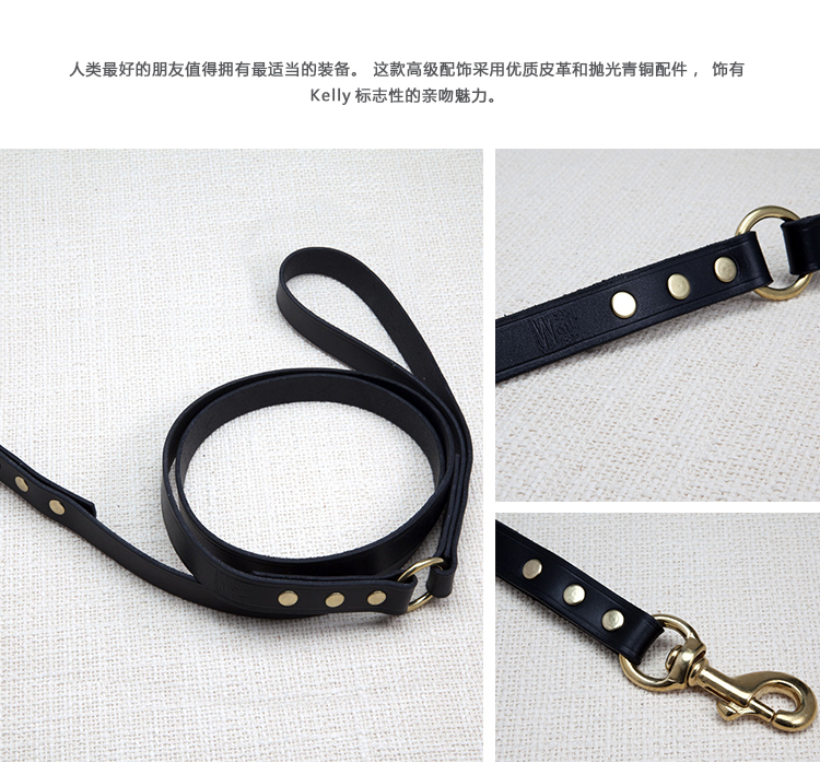 人类最好的朋友值得拥有最适当的装备。 这款高级配饰采用优质皮革和抛光青铜配件,饰有Kelly标志性的亲吻魅力。