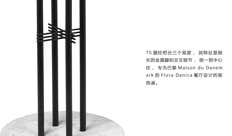 TS圆柱桌三个高度,其特征是细长的金属腿和交叉细节,统一到中心柱,专为巴黎Maison du Danemark的Flora Danica餐厅设计的装饰桌。 作为这个宏伟的空间,桌子代表了斯堪的纳维亚极简主义与全球优雅。 TS Column Table为私密用餐,社交和氛围氛围设定了框架,重点放在真实的材料选择和精心制作的工艺上。
