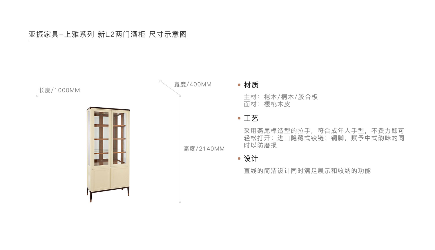 采用燕尾榫造型的拉手,符合成年人手型,不费力即可轻松打开;进口隐藏式铰链;铜脚,赋予中式韵味的同时以防磨损。直线的简洁设计同时满足展示和收纳的功能。