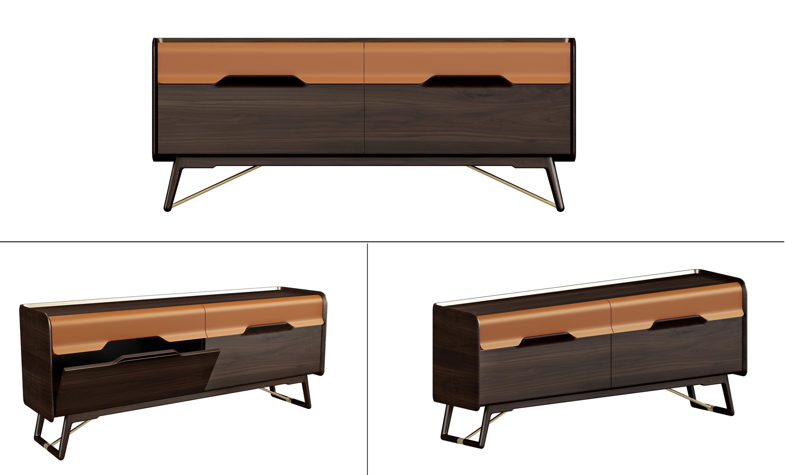 1.无拉手设计,精巧别致,创意十足。 2.柜体腿部内收,上收下分,具有很好的视觉稳定感,稳重大方。 3.双色设计,对比明快,增加视觉跳跃感与家具层次感。