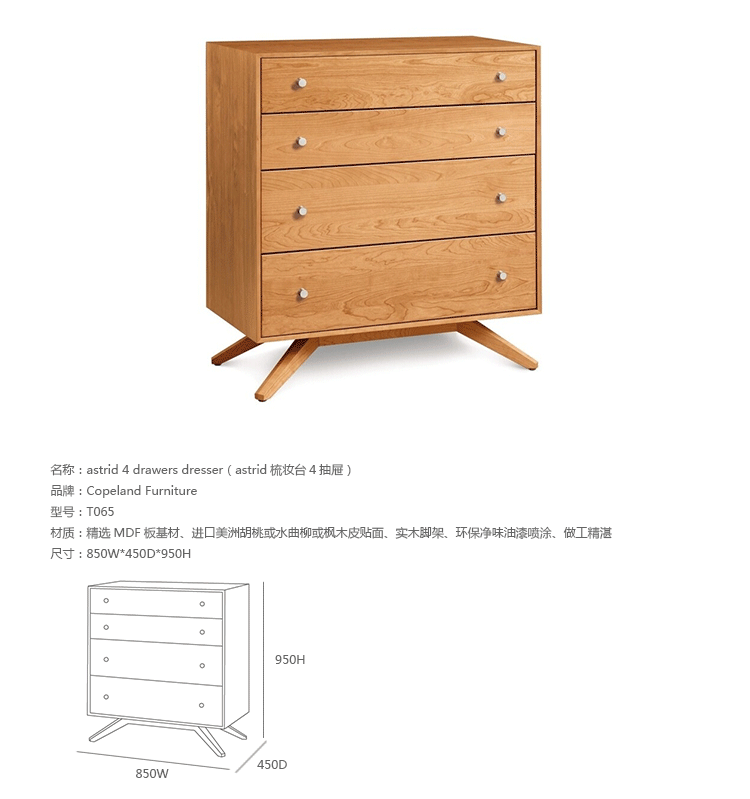 astrid 4 drawers dresser(阿斯特丽德4抽梳妆台)是Copeland Furniture公司astrid实木梳妆台系列之一,宽大的八字形脚架非常吸引人注目,制作并非易事,它其实是一个大工程,同时能引发无限期望和激情,4个平滑抽屉,可以给与提供许多存储空间。制作采用精选MDF板基材、进口美洲胡桃或水曲柳或枫木皮贴面、实木脚架、环保净味油漆喷涂、做工精湛。