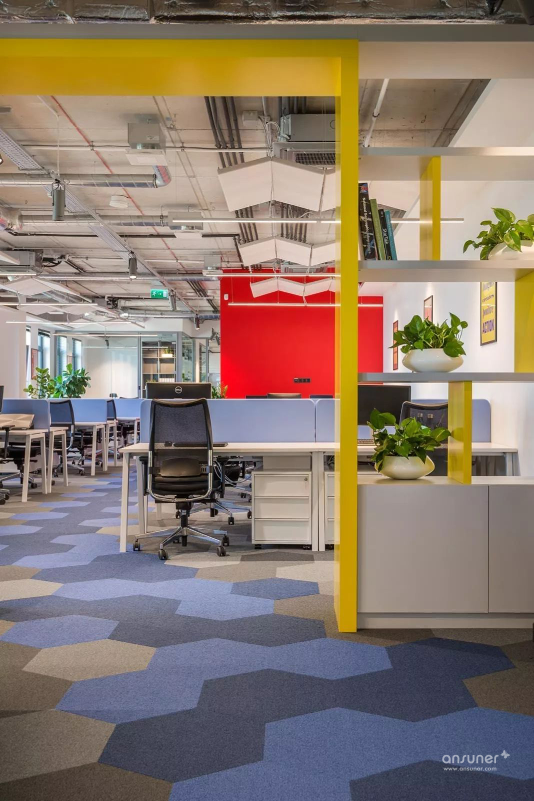 在整个办公室中,设计师添加了大量的绿色植物,一些自然元素和其他的装饰品,其中一些植物组成了个性的主题墙。